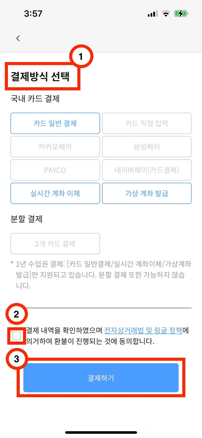 주문 상품 상세 정보 확인 → 결제 방식 선택 (해외 결제 수단으로 변경 가능) → [동의] → [결제하기] 클릭