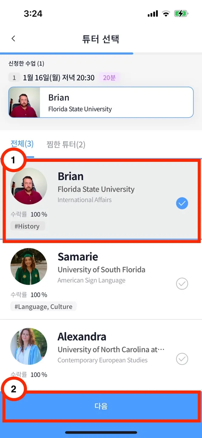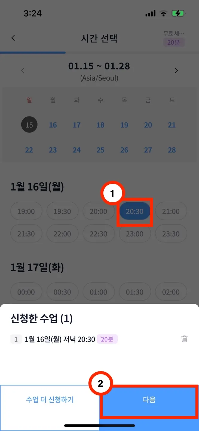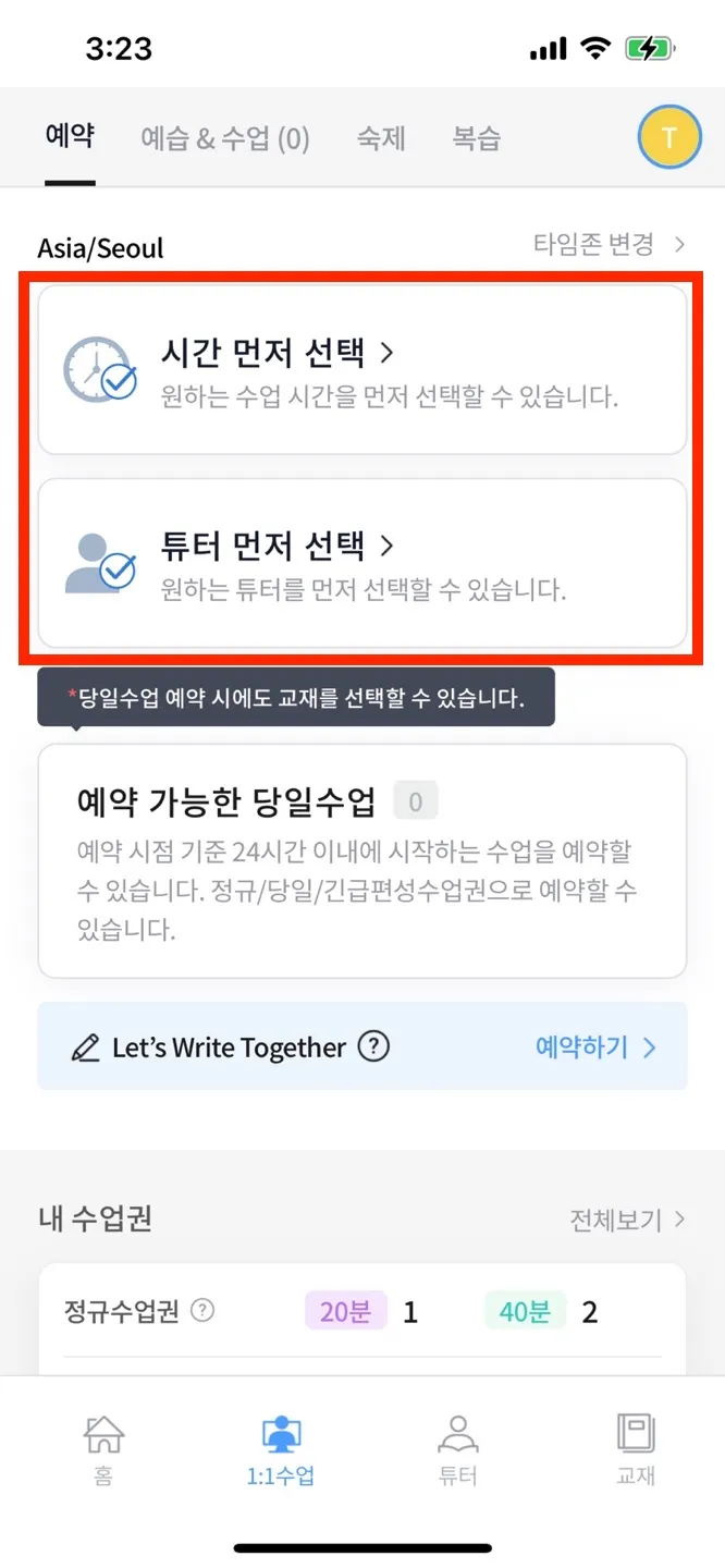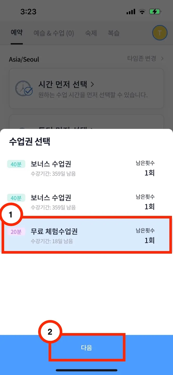 2-(2). [무료 체험 수업권] 클릭 → 시간 선택 후 튜터 선택 OR 튜터 선택 후 시간 선택