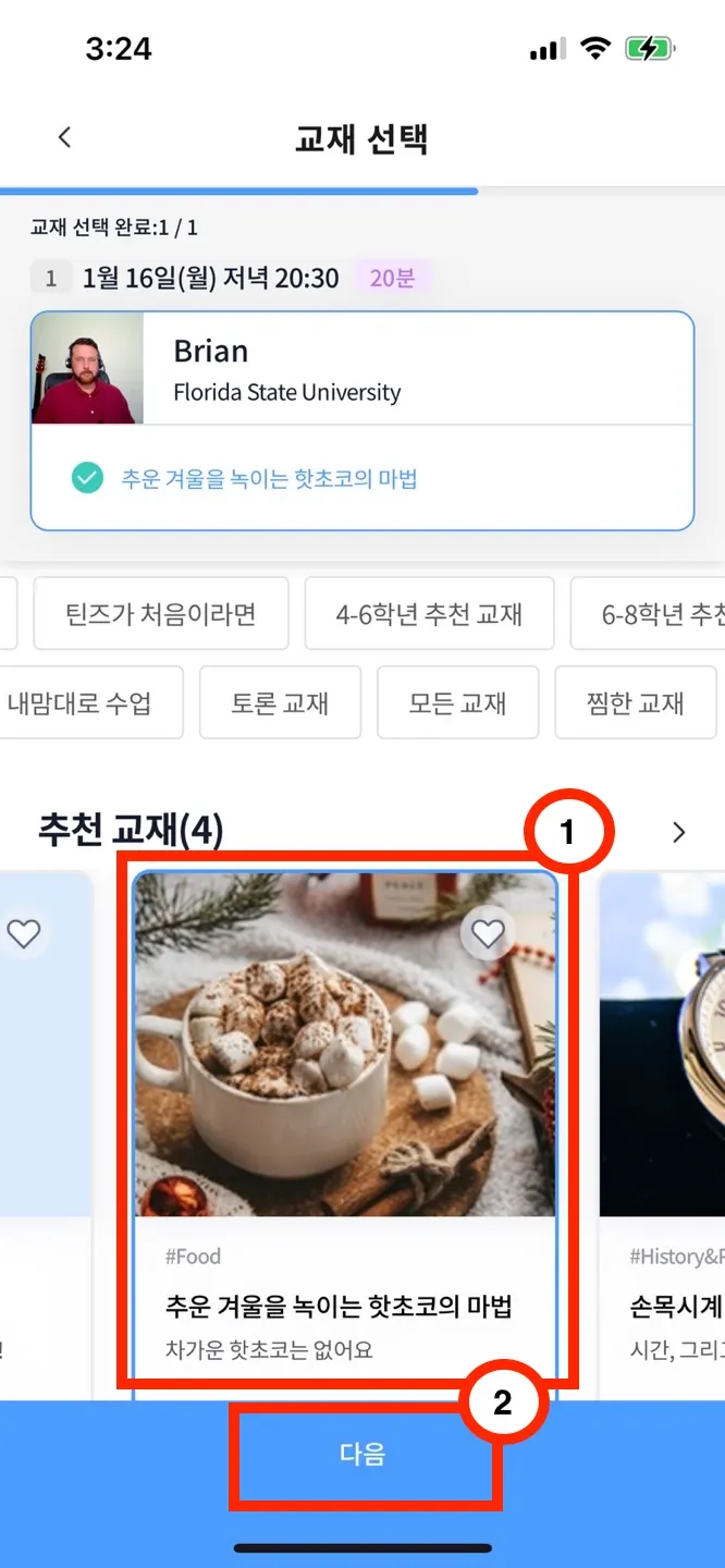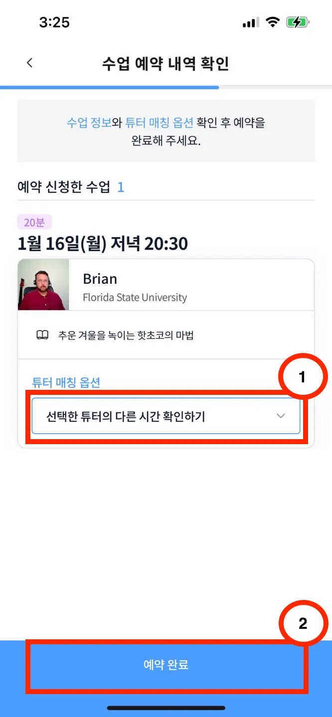2-(3). 교재 선택 → 튜터 매칭 옵션 선택 → [예약 완료] 클릭