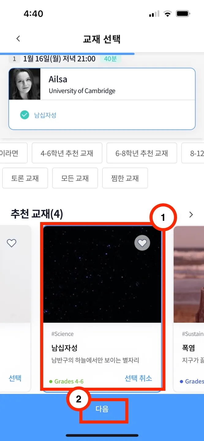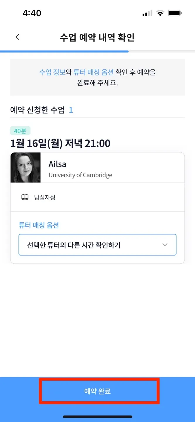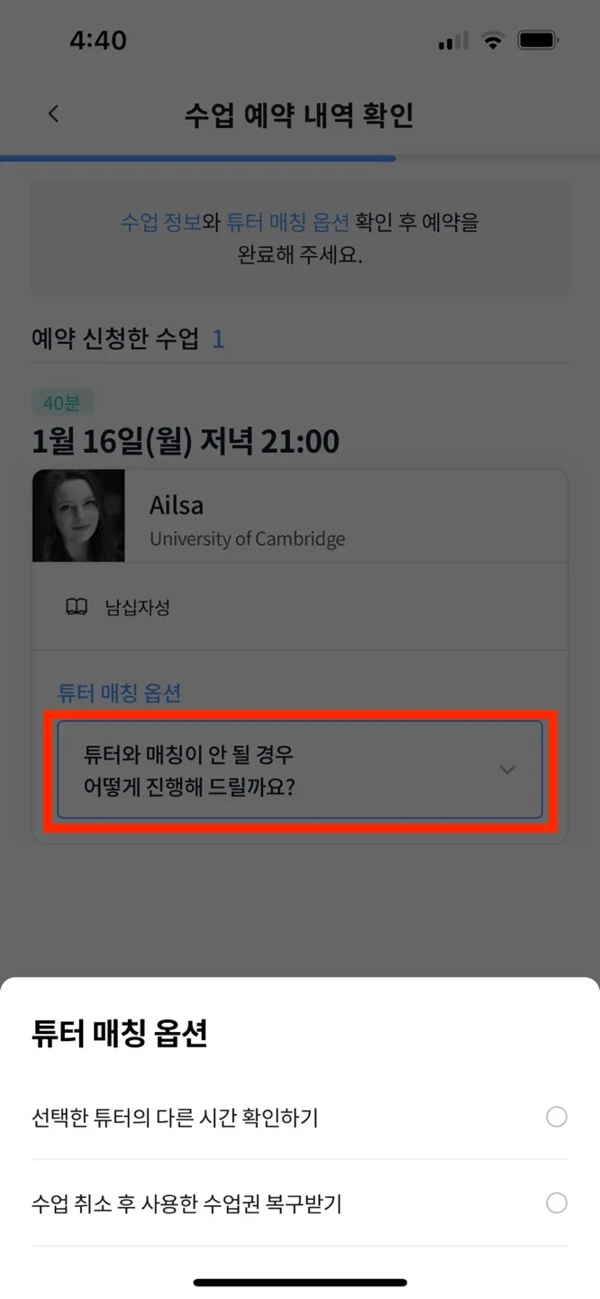 1-(3). 교재 클릭해서 내용 확인 후 선택 → 튜터 매칭 옵션 선택 → 예약 내역 확인 후 [예약 완료] 클릭