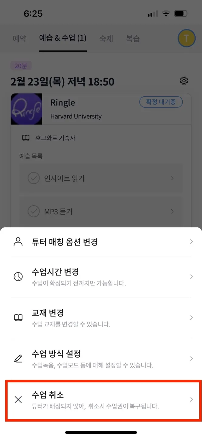 자녀 계정 내 [예습&수업] 탭 클릭 → 우측 톱니바퀴 클릭 → [수업 취소] → 취소 사유 선택