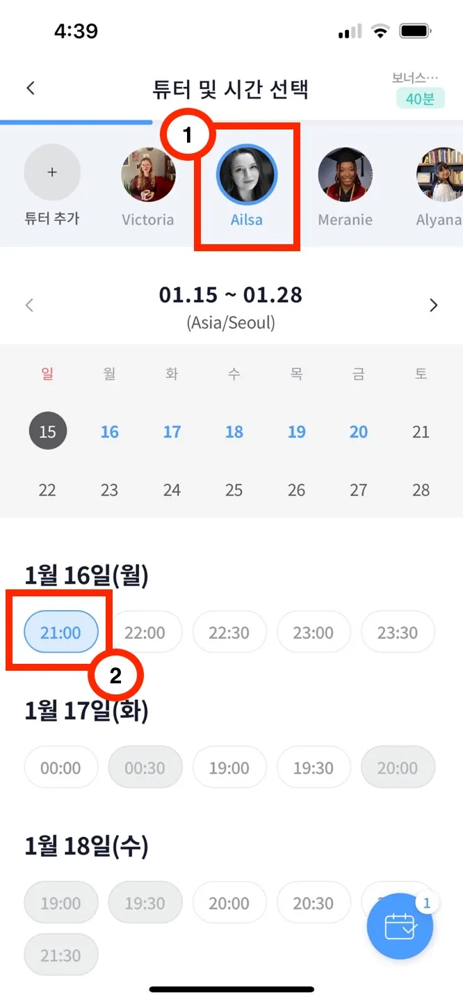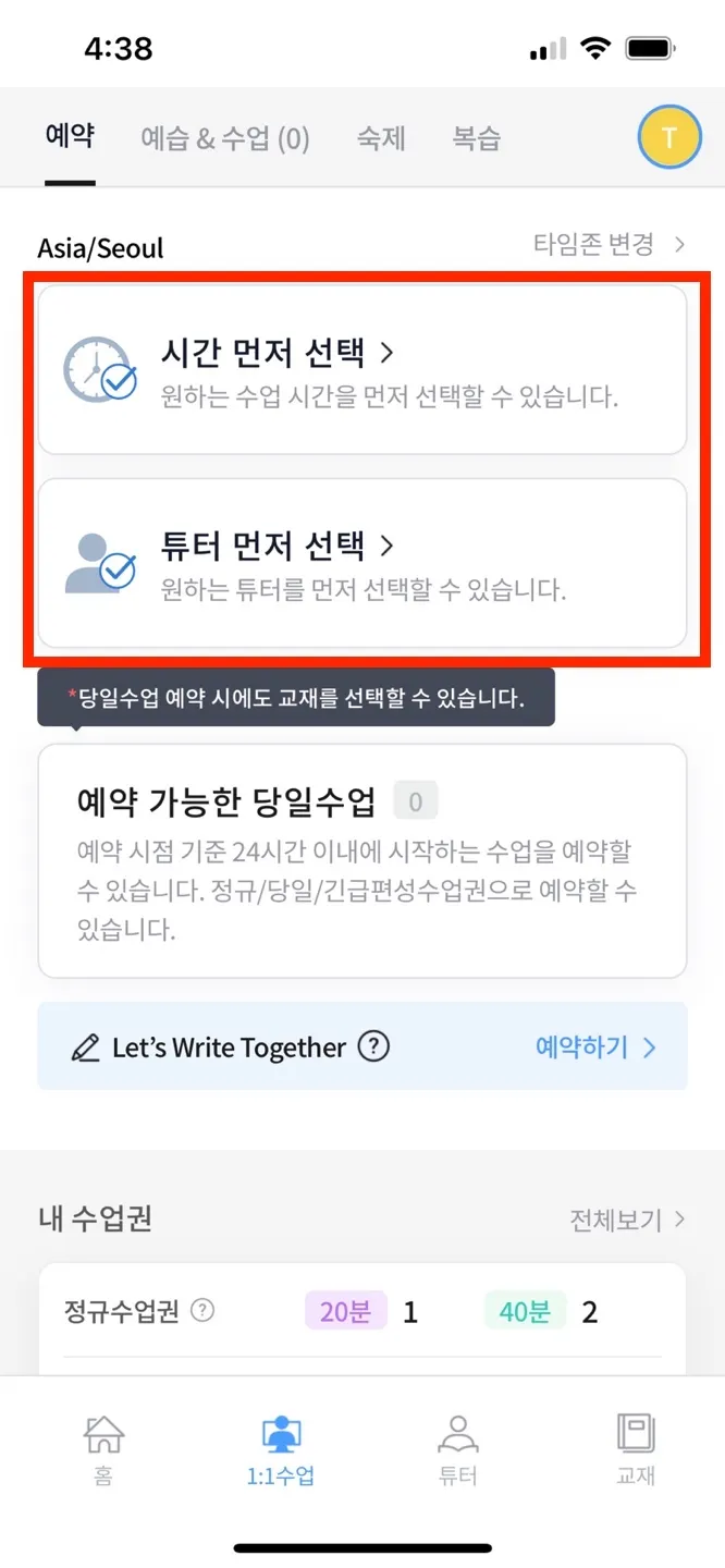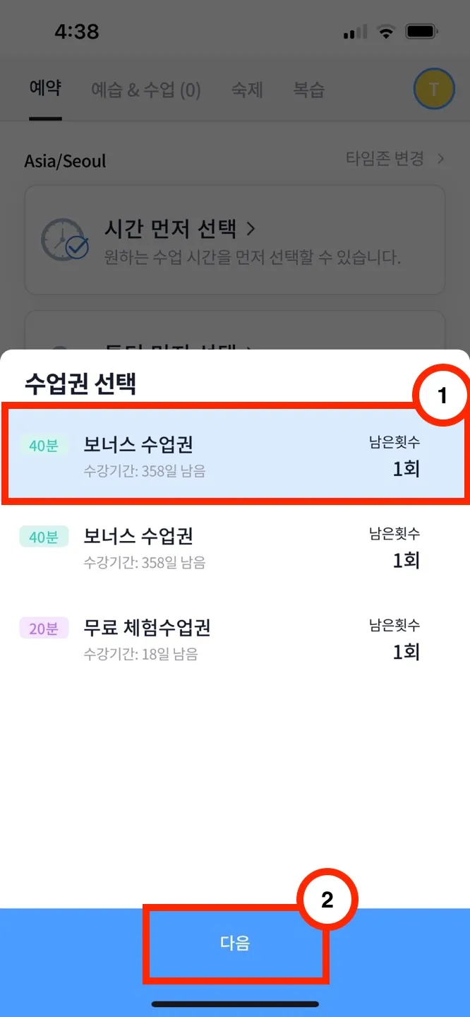 1-(2). 사용하고자 하는 수업권 선택 → 시간/튜터 선택 → 신청한 수업 정보 확인