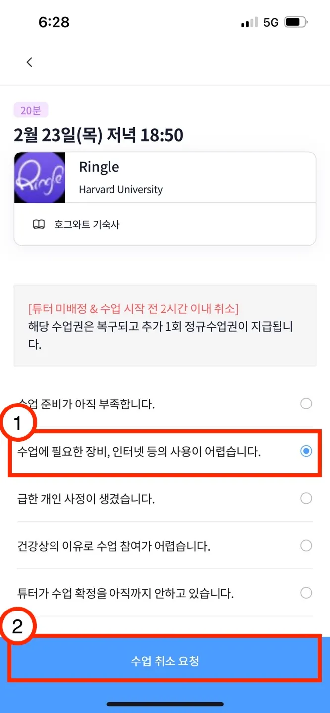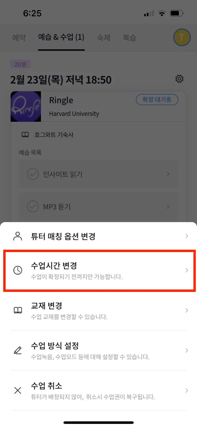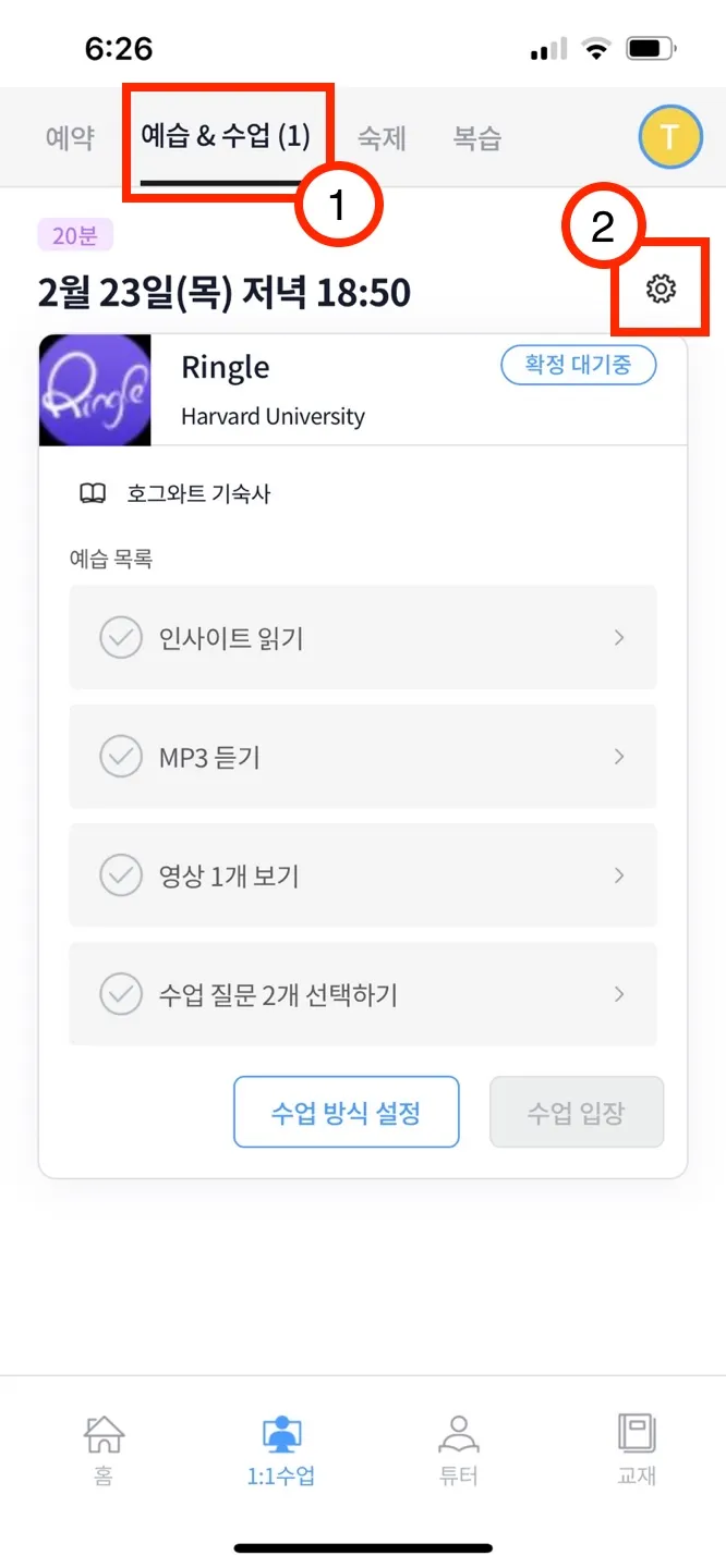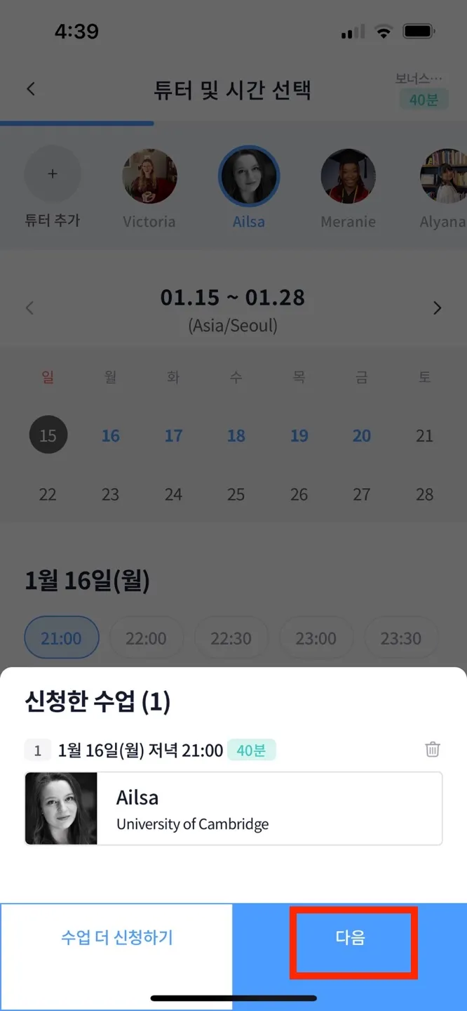 1-(2). 사용하고자 하는 수업권 선택 → 시간/튜터 선택 → 신청한 수업 정보 확인