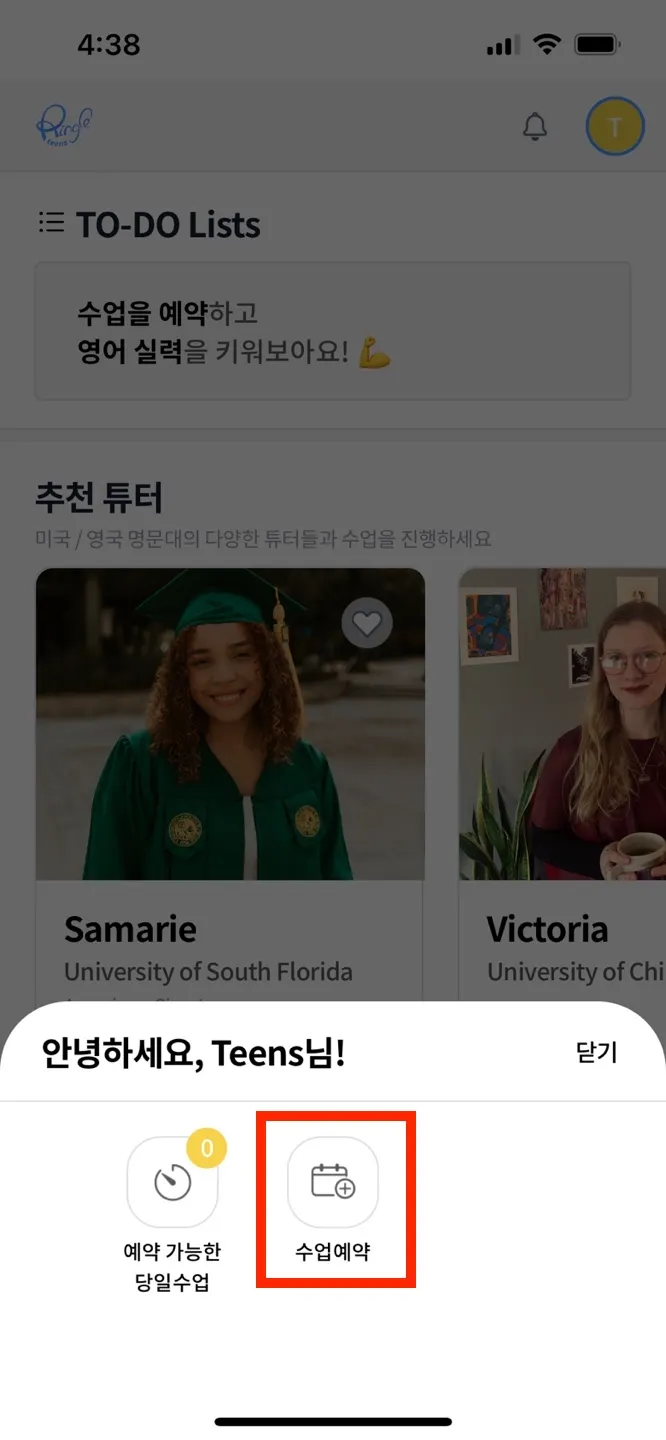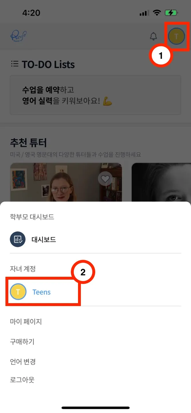1-(1). 우측 상단의 프로필 → [자녀 계정] 클릭 → [수업 예약] 클릭 → [시간/튜터 먼저 선택] 클릭