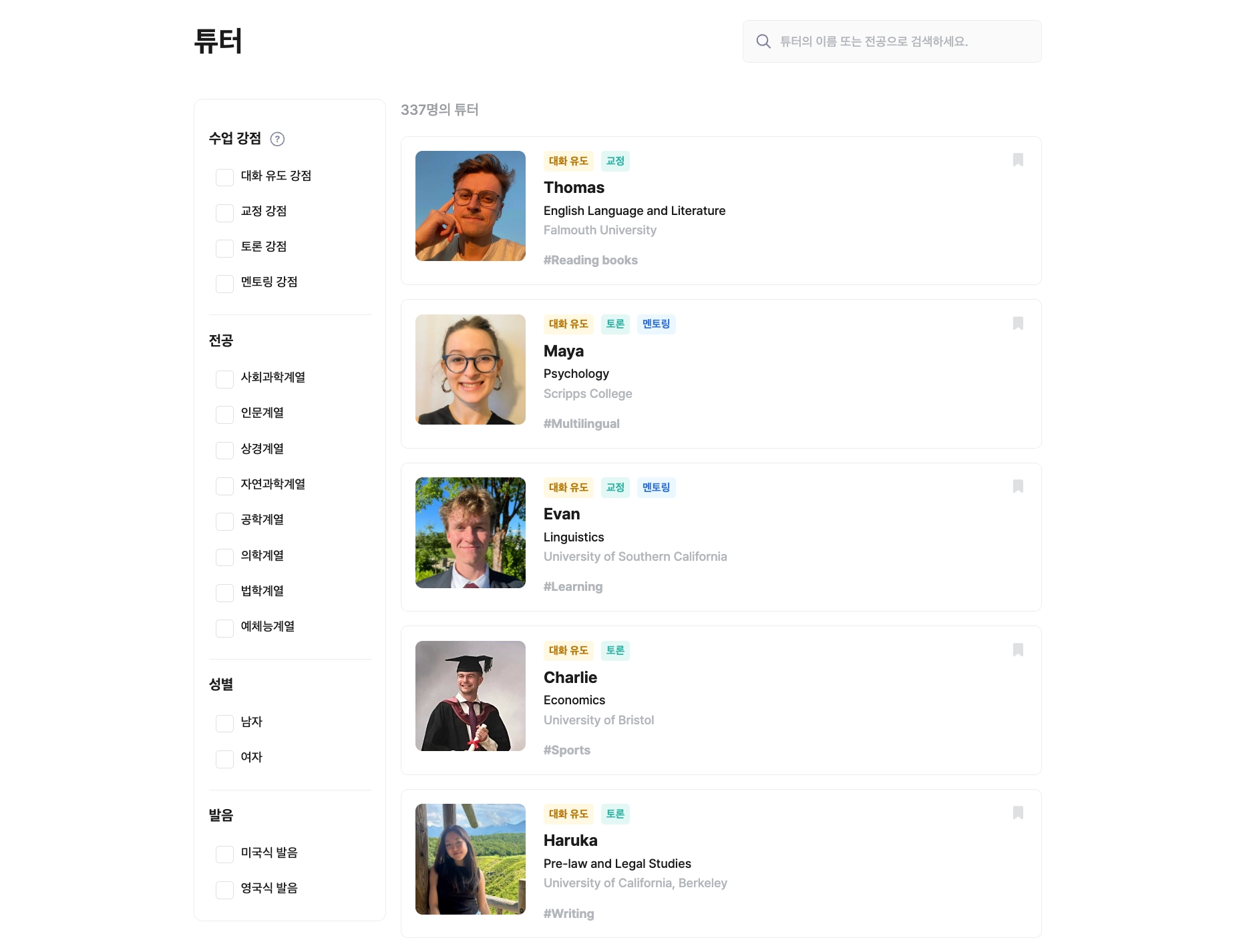 영미의 검증된 학교 출신, 다양한 전공을 가진 튜터