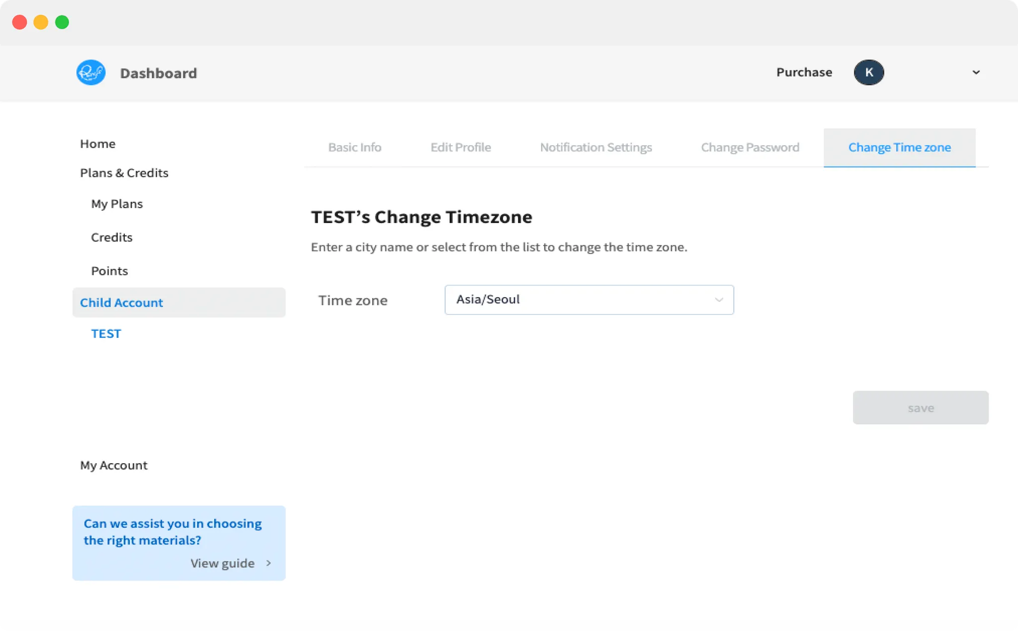 로그인 → 우측 사람 모양 아이콘 → [계정 관리] → [타임존 변경] 클릭하여 거주하는 도시를 선택하세요.