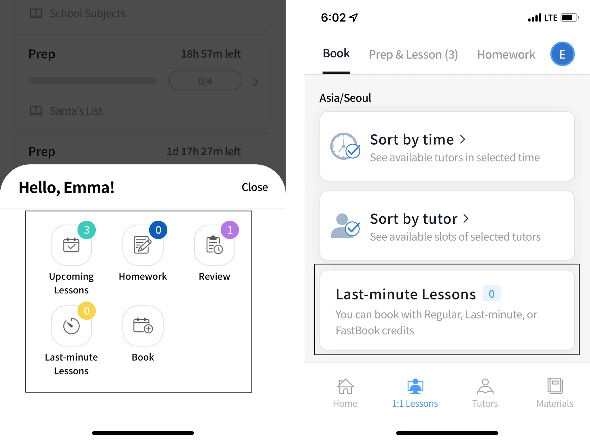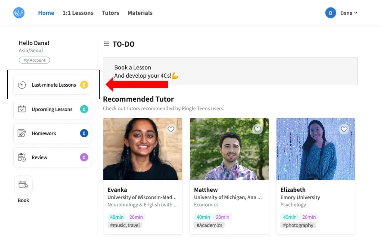 1-(2). 하단 [1:1 Lessons] → [Book] → [Last-minute Lessons] 탭