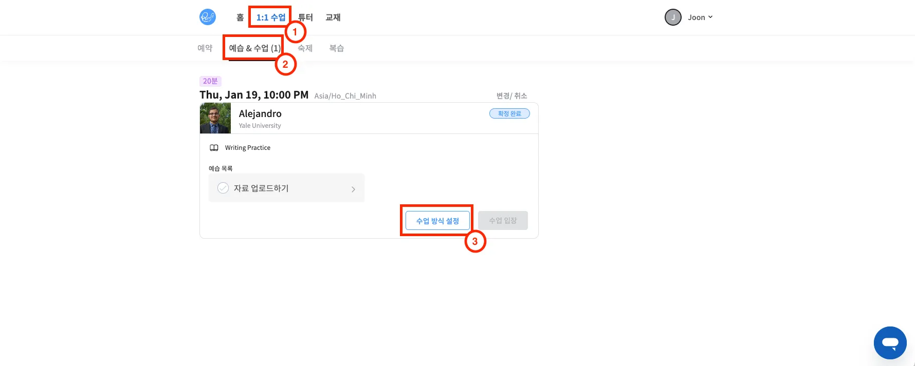 [1:1 수업] → [예습&수업] → 해당 수업의 [변경/취소] 버튼을 클릭해 주세요.