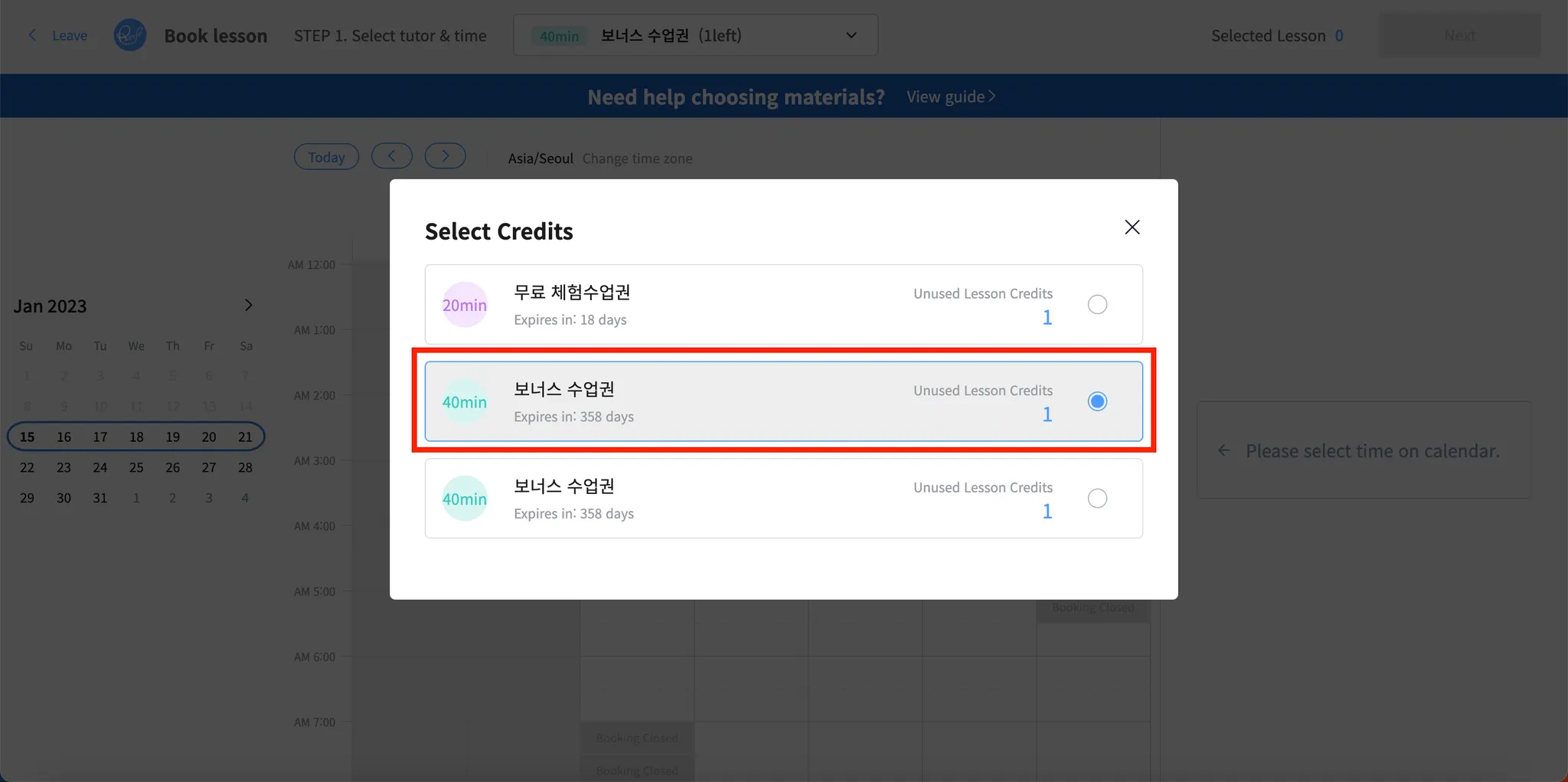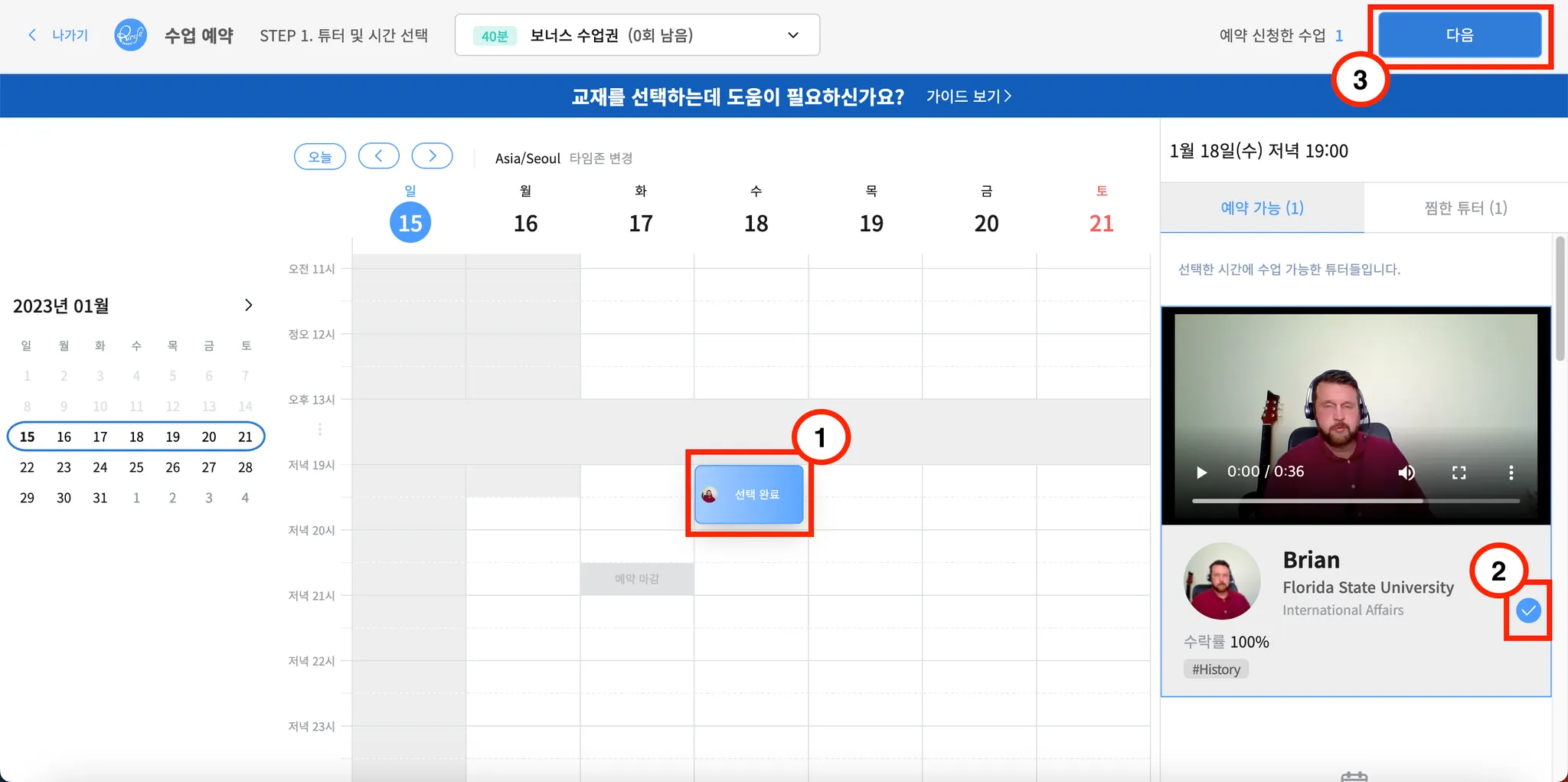 [수업권] 클릭 → 날짜 및 시간 선택 → 가능한 튜터 확인 후 선택 → [다음] 클릭