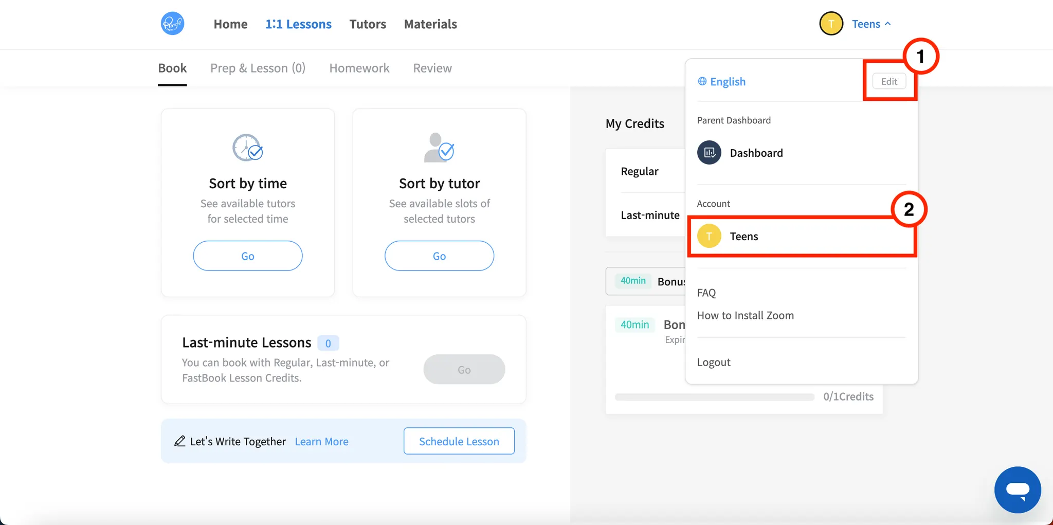 1-(1). 링글 Teens 웹사이트로 로그인 후 자녀 학습 공간 - [자녀 계정] 클릭