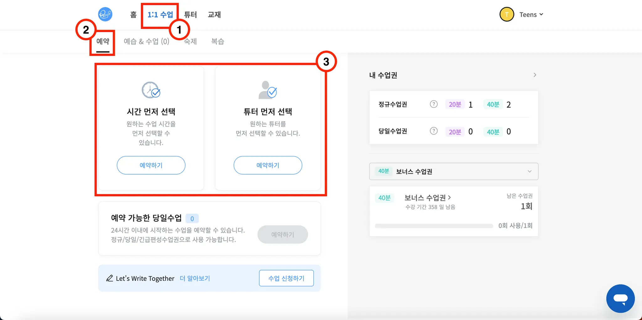 1-(2). [1:1 수업] → [예약] 클릭 → [시간 먼저 선택] / [튜터 먼저 선택] 중 희망하는 예약 방법 선택