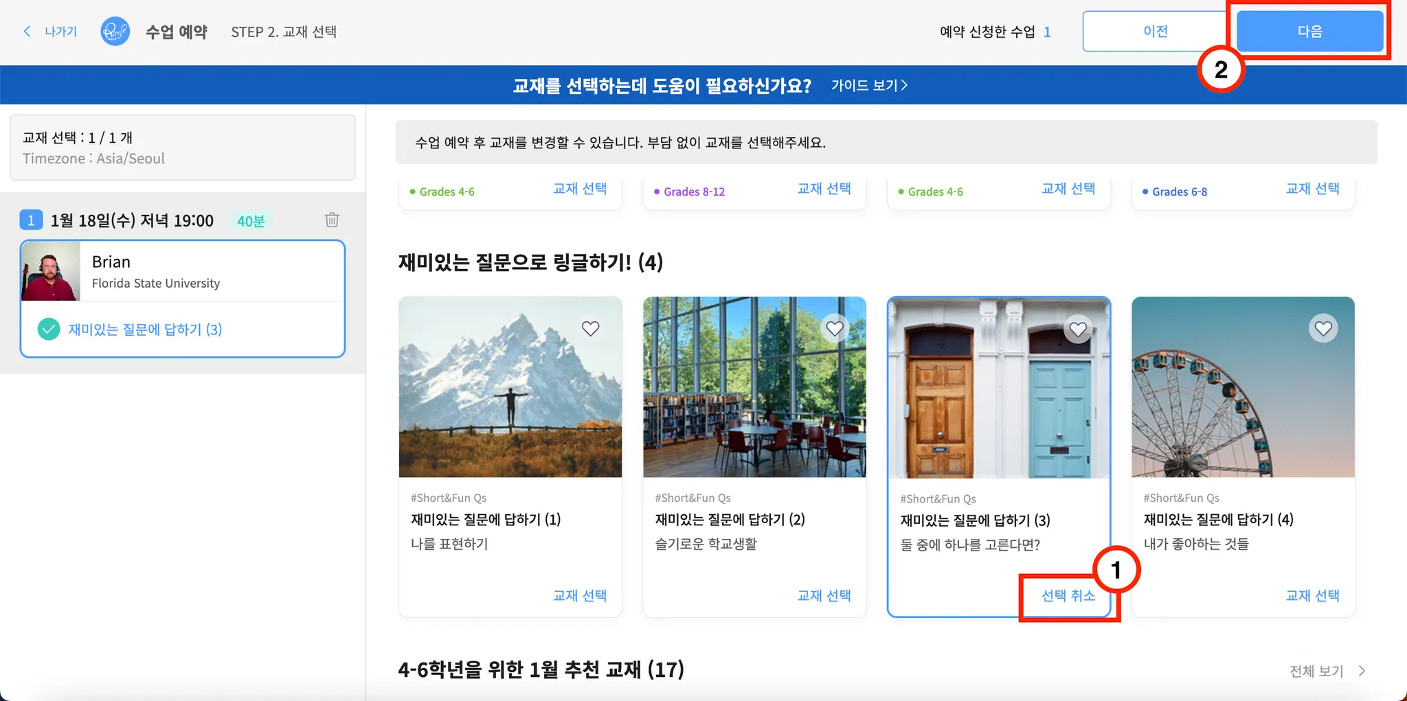 *교재 카테고리 클릭 → 교재 내용 확인 후 → 교재 선택 → 다음 클릭